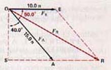 The angle between two forces acting on the same point is often not a right angle. Figure 4-6 represents the vectors for the two forces 10.0 n east and 15.0 n 40.0o east of south acting on point O. The parallelogram is completed as shown. Observe that the diagonal vector representing the resultant is drawn from the point on which the two original forces are acting since the resultant will also act on this point. The magnitude of FR is found graphically to be 23 n. The direction is 30o south of east.