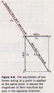 See Figure 4-8. The equilibrant of three or more concurrent forces can be found in a similar way. First find the resultant by vector addition. Then the equilibrant is graphically drawn from the origin of the forces so that it is equal in magnitude to the resultant but extends in the opposite direction. When two or more forces act concurrently at a paint, the equilibrant force is that single force that if applied at the same point would produce equilibrium.
