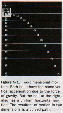 What will be the path of such an object? The ball in Figure 5-1 illustrates such motion. It was released at the same time as the ball on the left, but had a uniform horizontal velocity. The horizontal distances between adjacent images of the right-hand ball are equal. This indicates that the ball is still traveling horizontally with uniform velocity.