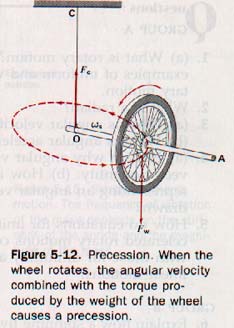 To understand precession, we will need to see Figures 5-12. In Figure 5-12, OA is the shaft of a wheel spinning counterclockwise as seen from A. OC is the cord from which the shaft is suspended. The weight of the wheel produces a clockwise torque about O (as seen from the front), is the vector representing the angular velocity of the spinning wheel.