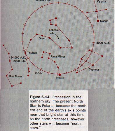 Because of the resulting torque, the earth's axis goes through a precessional motion and does not point continually at the same place in space. See Figure 5-14. The earth's axis completes a single precessional cycle in 26,000 years. We will soon need a new "North Star".