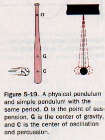 Any real object that can vibrate like a pendulum is called a physical pendulum, as distinguished from a theoretical simple pendulum. For example, a baseball bat can be a physical pendulum as shown in Figure 5-19. When the bat is suspended from O, which is called the center of suspension, and set in vibration, its period will be the same as that of a simple pendulum with a length equal to the distance OC.