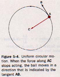 If the speed of the ball in the circular path varies, its motion is variable circular motion. Imagine that you are at a location where there is no force of gravity. You attach a ball to a string as shown in Figure 5-4 and hold the string at C. Then you give the ball an initial velocity in the direction of B, tangent to the circumference of the circle. The ball whirls in a circular path around C.