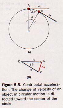 This example can also be analyzed by means of velocity vectors. Even though the speed of the ball in its circular path is uniform, the velocity is constantly changing. In Figure 5-5(A), A and B represent two successive positions of an object moving with uniform circular motion about point O. The velocity vector vi indicates the velocity of the object when at point A, and the velocity vector vf indicates its velocity at point B. The velocity vectors, vi and vf, are tangent to the circle at A and B respectively, and are thus perpendicular to the respective radii OA and OB.