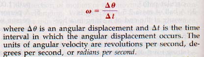 5.6 Angular Velocity For uniform linear motion, velocity is defined as the time rate of displacement. Similarly, for uniform rotary motion, angular velocity is defined as the time rate of angular displacement. Angular displacement is the angle about the axis of rotation through which the object turns. The symbol for angular velocity is the Greek letter omega. The equation for angular velocity is
